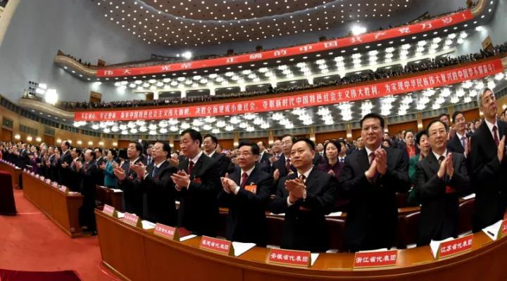 人民大会堂雄伟庄严,万人大礼堂气氛热烈。主席台上方悬挂着“中国共产党第十九次全国代表大会”的会标,后幕正中是镰刀和锤头组成的党徽,10面鲜艳的红旗分列两侧。二楼和三楼眺台上分别悬挂着“不忘初心,牢记使命,高举中国特色社会主义伟大旗帜,决胜全面建成小康社会,夺取新时代中国特色社会主义伟大胜利,为实现中华民族伟大复兴的中国梦不懈奋斗!”“伟大、光荣、正确的中国共产党万岁!”的横幅。