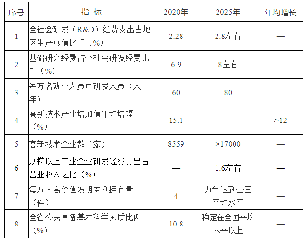 规划指出,到2025年,全省科技创新攻坚力量体系和科技成果转化应用体系基本形成,全社会研发经费投入、高新技术企业数、每万人高价值发明专利拥有量等创新主要指标明显提升,区域创新能力保持全国第一方阵并争先进位,初步建成全国具有重要影响力的科技创新策源地和创新型省份。